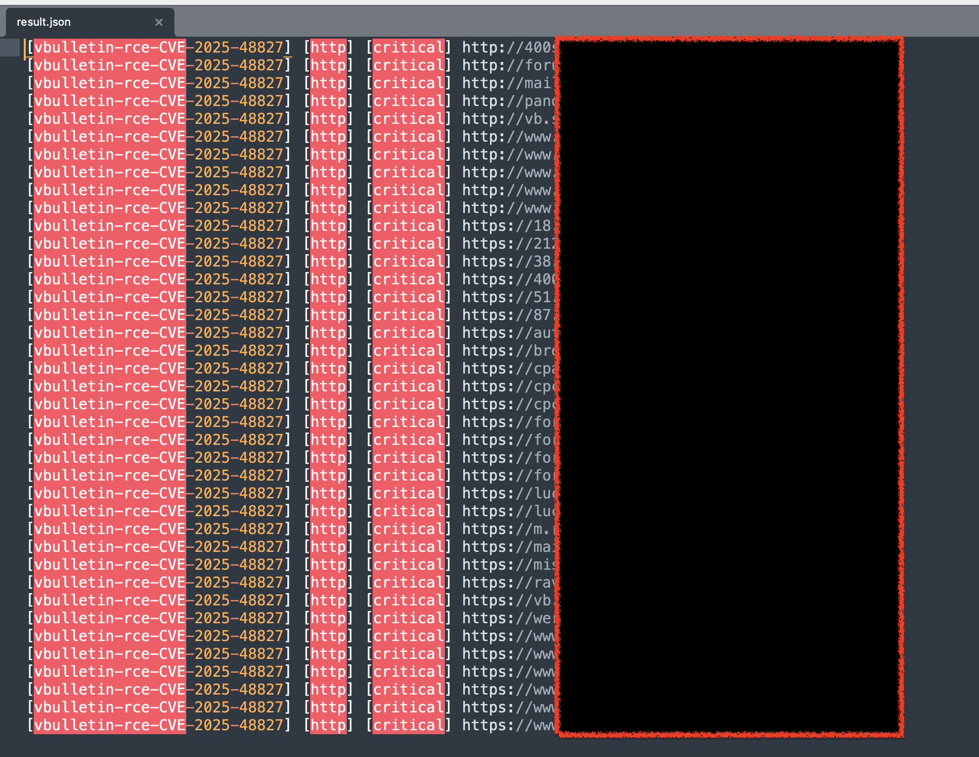 nuclei -t vbulletin-rce-CVE-2025-48827.yaml -l test.txt -v -o result.json