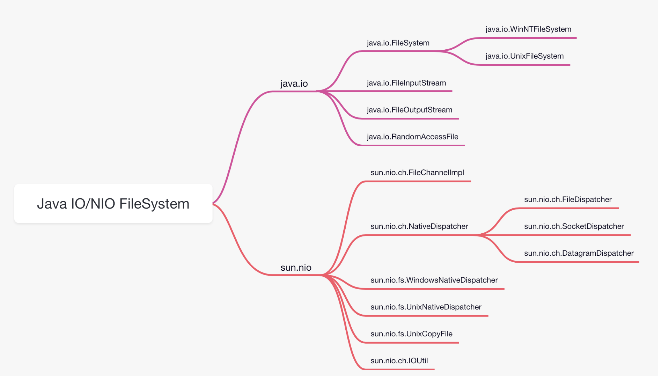 java.io.FileSystem中定义,文件的读取最终调用的是java.io.FileInputStream#read0、readBytes、java.io.RandomAccessFile#read0、readBytes,而写文件调用的是java.io.FileOutputStream#writeBytes、java.io.RandomAccessFile#write0。 - Java有两类文件系统API!一个是基于