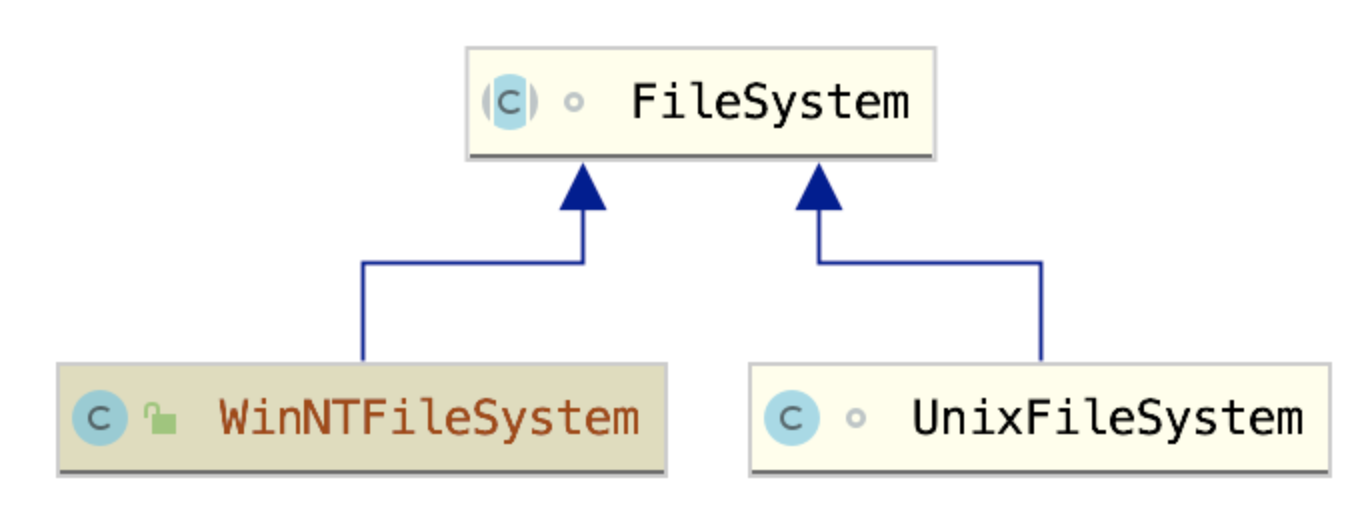 Java抽象出了一个叫做文件系统的类:java.io.FileSystem,不同的操作系统有不一样的文件系统,例如Windows和Unix就是两种不一样的文件系统: java.io.UnixFileSystem、java.io.WinNTFileSystem。
