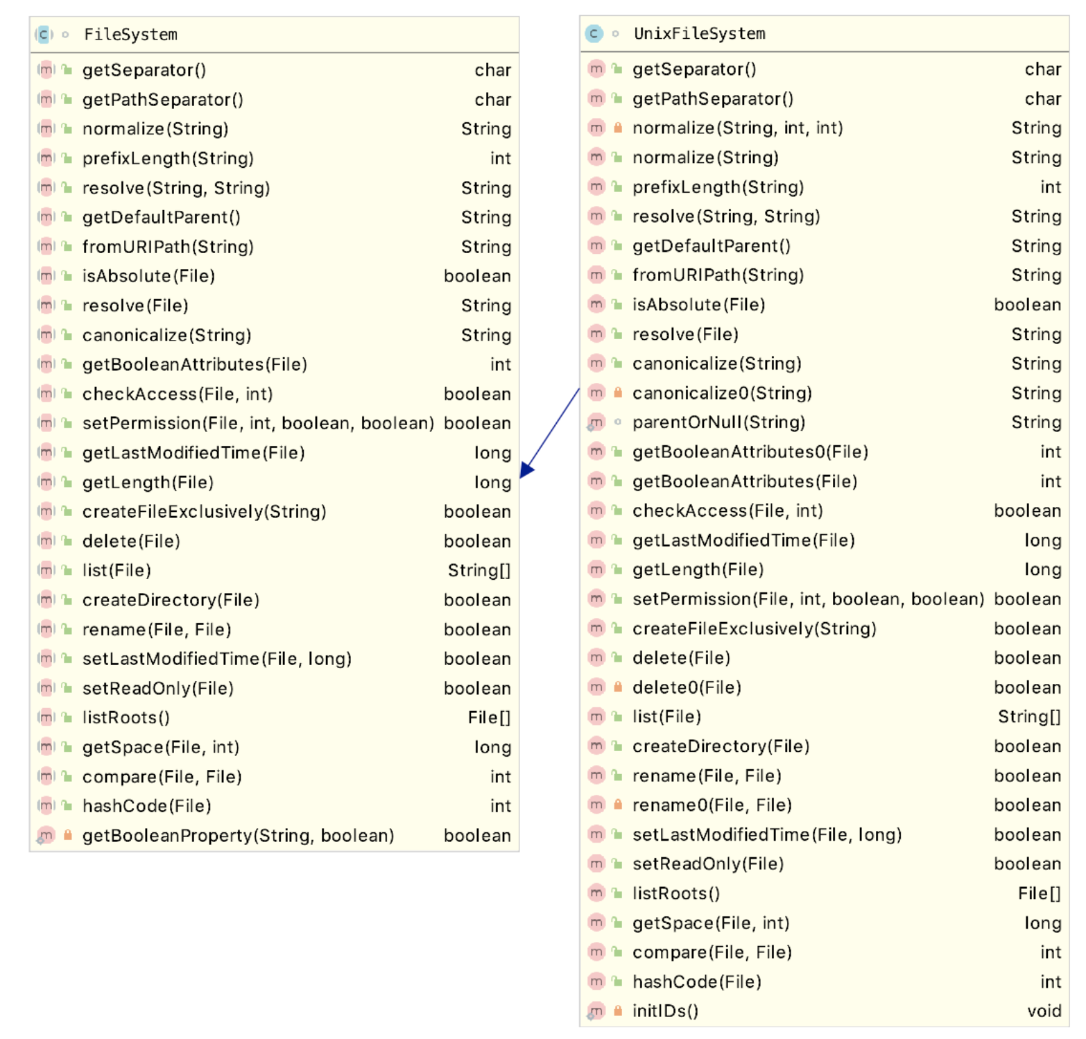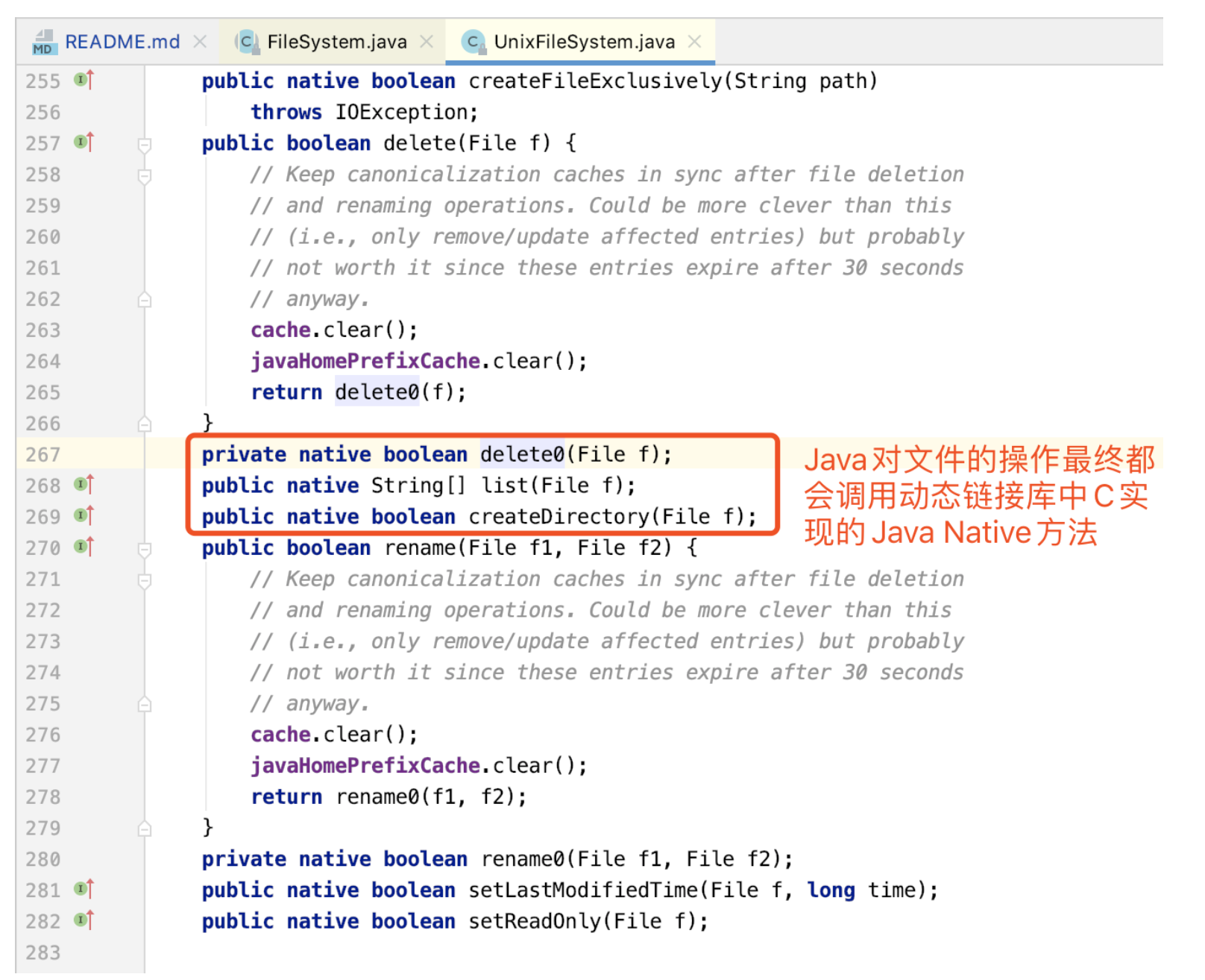 示例中的java.io.UnixFileSystem最终会通过JNI调用native方法来实现对文件的操作: