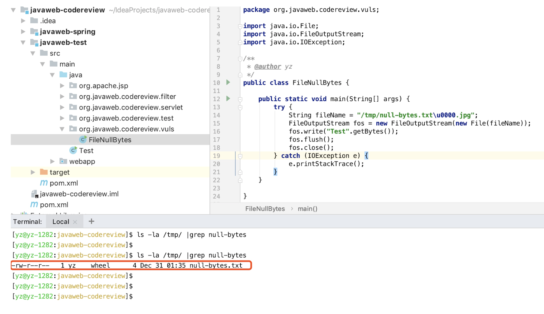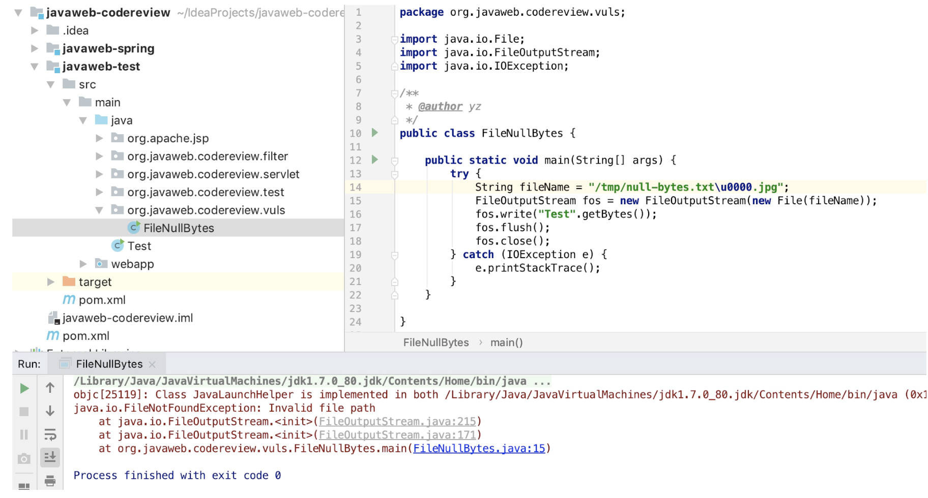 空字节截断漏洞漏洞在诸多编程语言中都存在,究其根本是Java在调用文件系统(C实现)读写文件时导致的漏洞,并不是Java本身的安全问题。不过好在高版本的JDK在处理文件时已经把空字节文件名进行了安全检测处理。