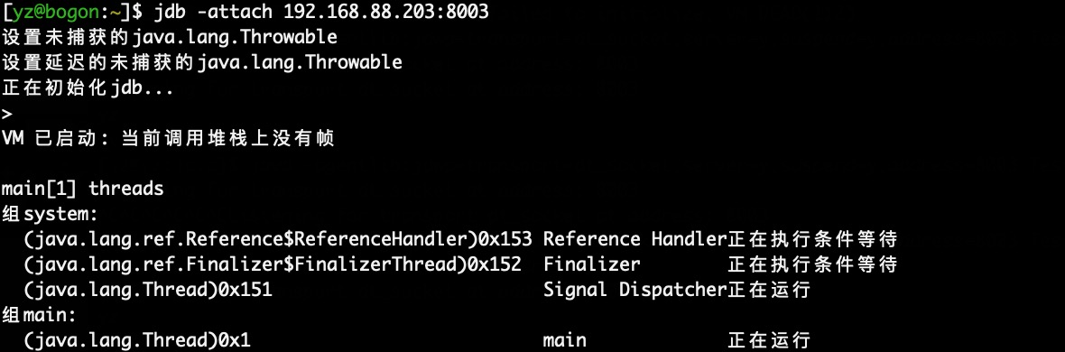 测试环境IP是:192.168.88.203,于是我们使用java自带的jdb(Java调试工具)来连接他的8003端口。