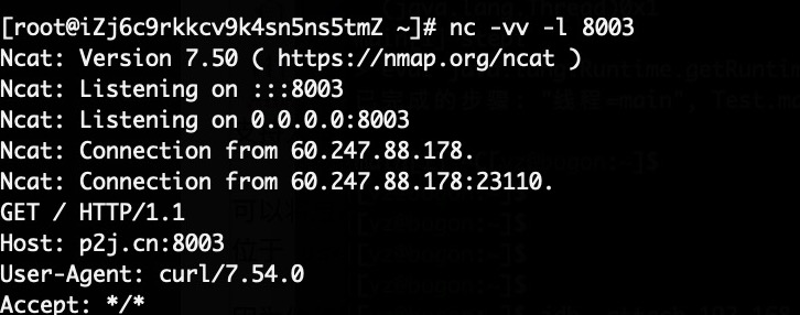 我们需要在远程服务器上nc下8003端口即可接收受攻击的机器curl过来的请求: