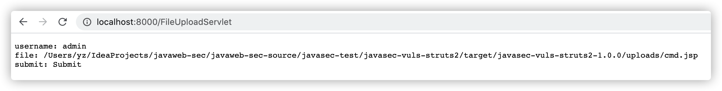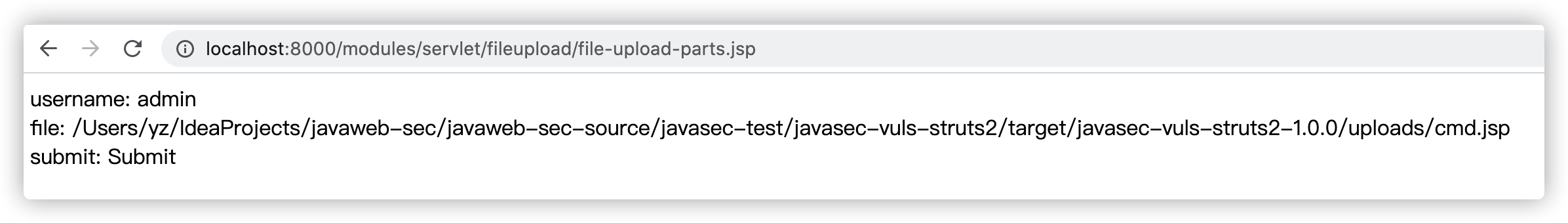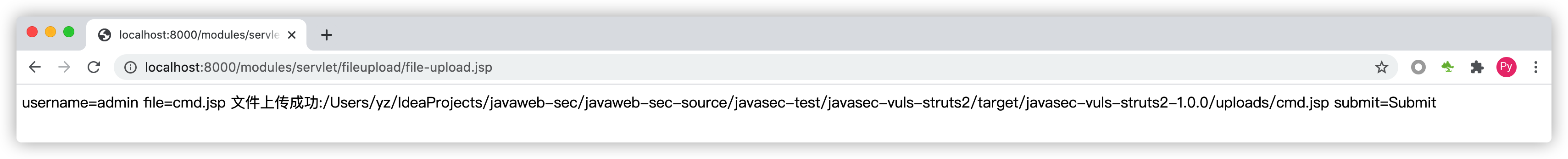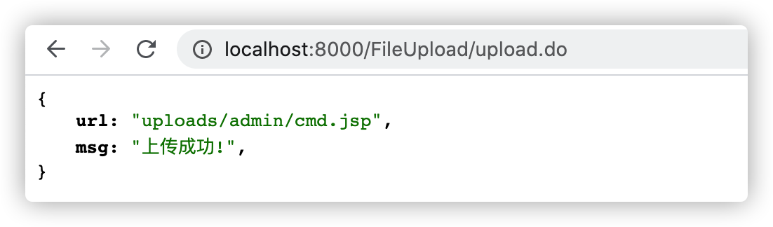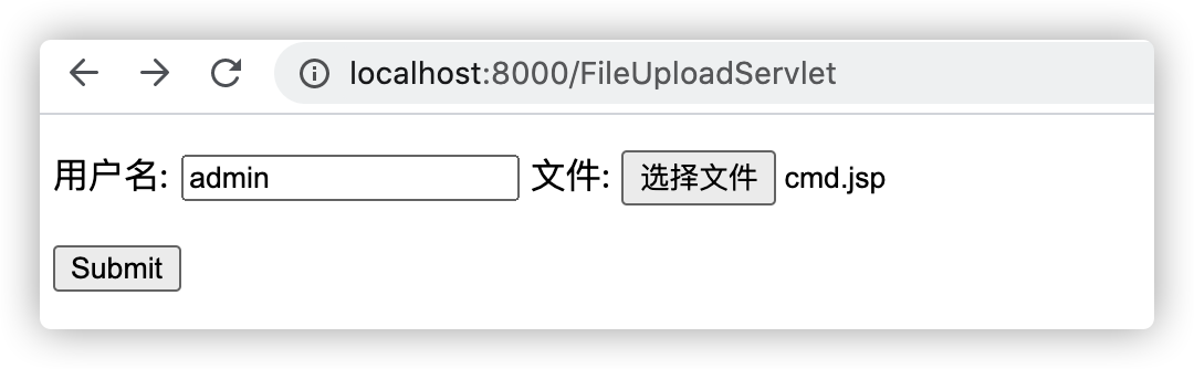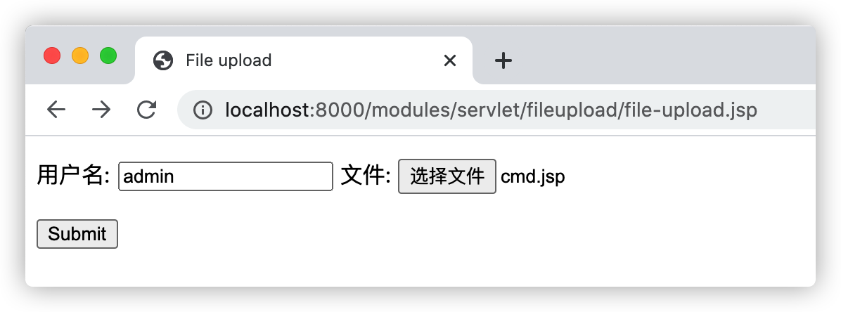 http://localhost:8000/modules/servlet/fileupload/file-upload.jsp,并选择一个恶意的jsp后门(示例上传的是一个本地命令执行的后门):
