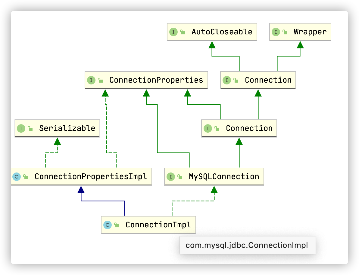 例如Mysql的驱动包的实现数据库连接的实现类是:com.mysql.jdbc.ConnectionImpl,该类实现了com.mysql.jdbc.MySQLConnection接口,而com.mysql.jdbc.MySQLConnection类是java.sql.Connection的子类,也就是说com.mysql.jdbc.ConnectionImpl接口必须实现java.sql.Connection定义的数据库连接和查询方法。