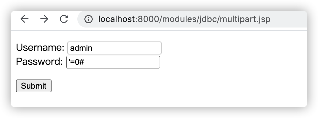 " Password:<input type=\"text\" name=\"password\" value=\"'=0#\"/><br/>\n" +