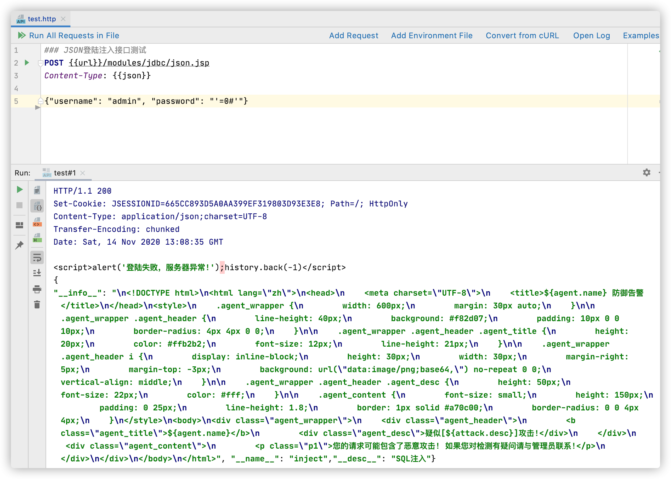 从上图可以看出,RASP将Hook到的SQL语句做词法解析,然后结合Http请求的参数做关联分析,得出password参数直接导致了SQL词法的语义变化,从而判定该SQL语句中包含了注入攻击,RASP会立即阻止SQL查询并阻断Http请求。