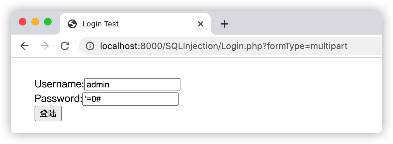 访问示例中的后台登陆地址:http://localhost:8000/SQLInjection/Login.php?formType=multipart,如下图: