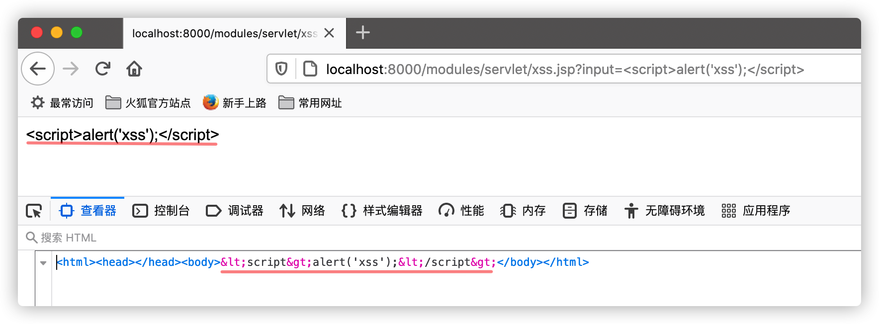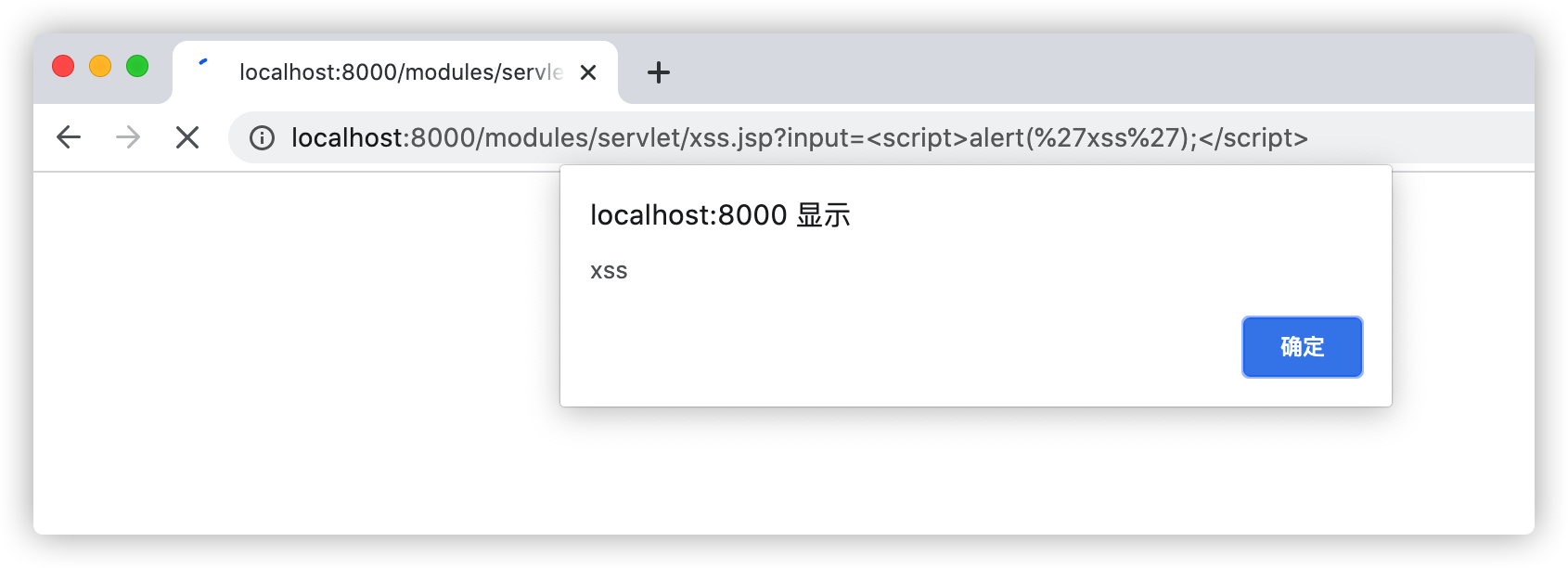 浏览器请求:[http://localhost:8000/modules/servlet/xss.jsp?input=%3Cscript%3Ealert(%27xss%27)%3B%3C/script%3E]