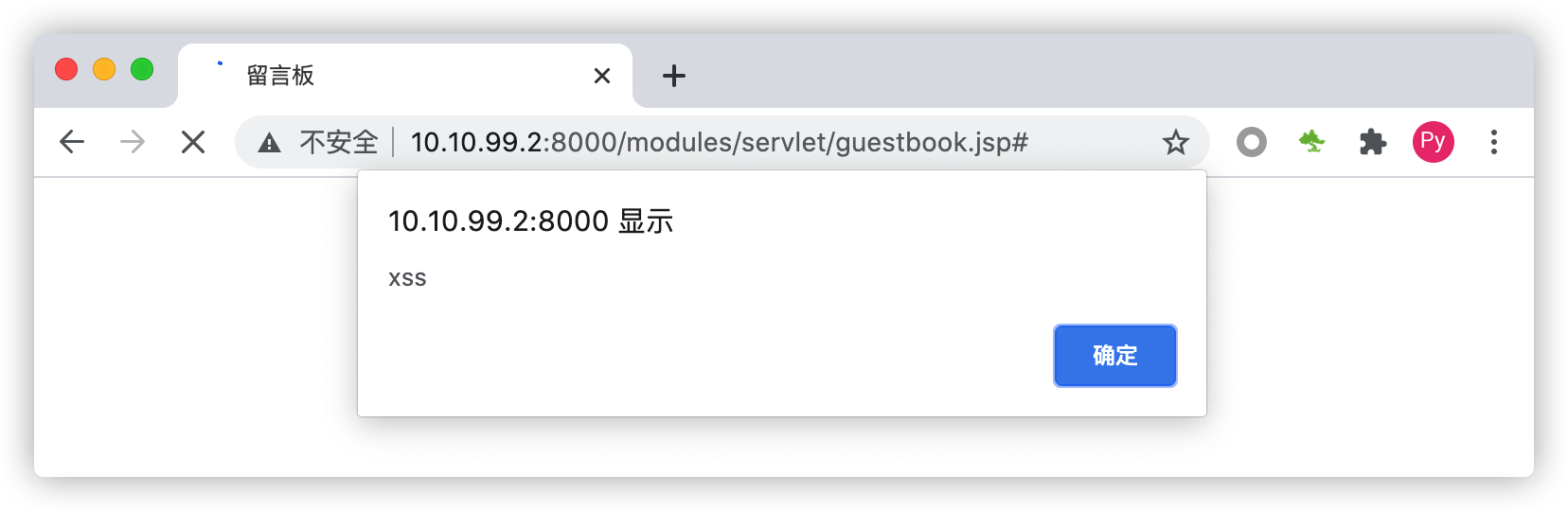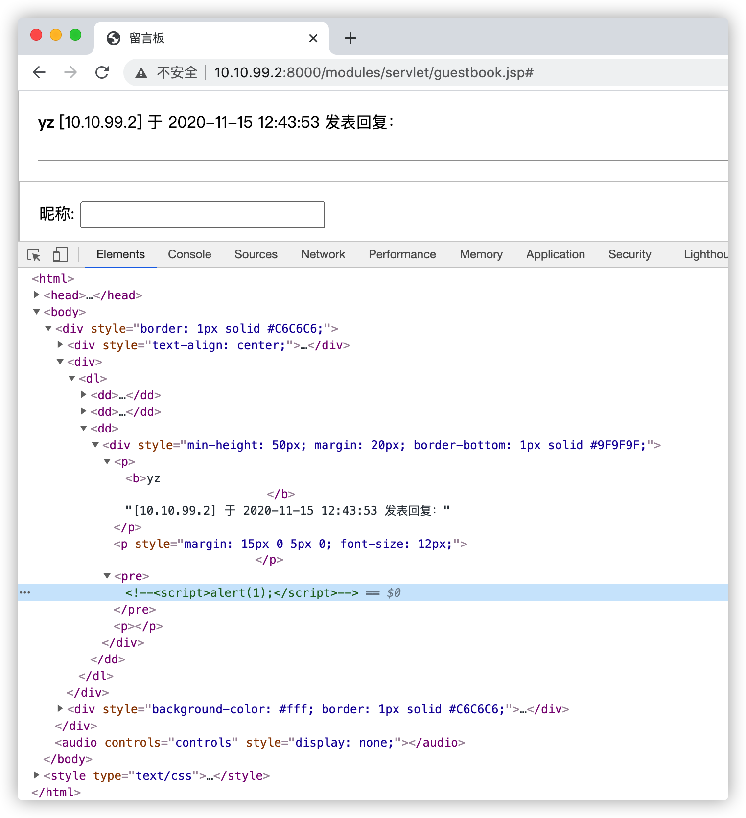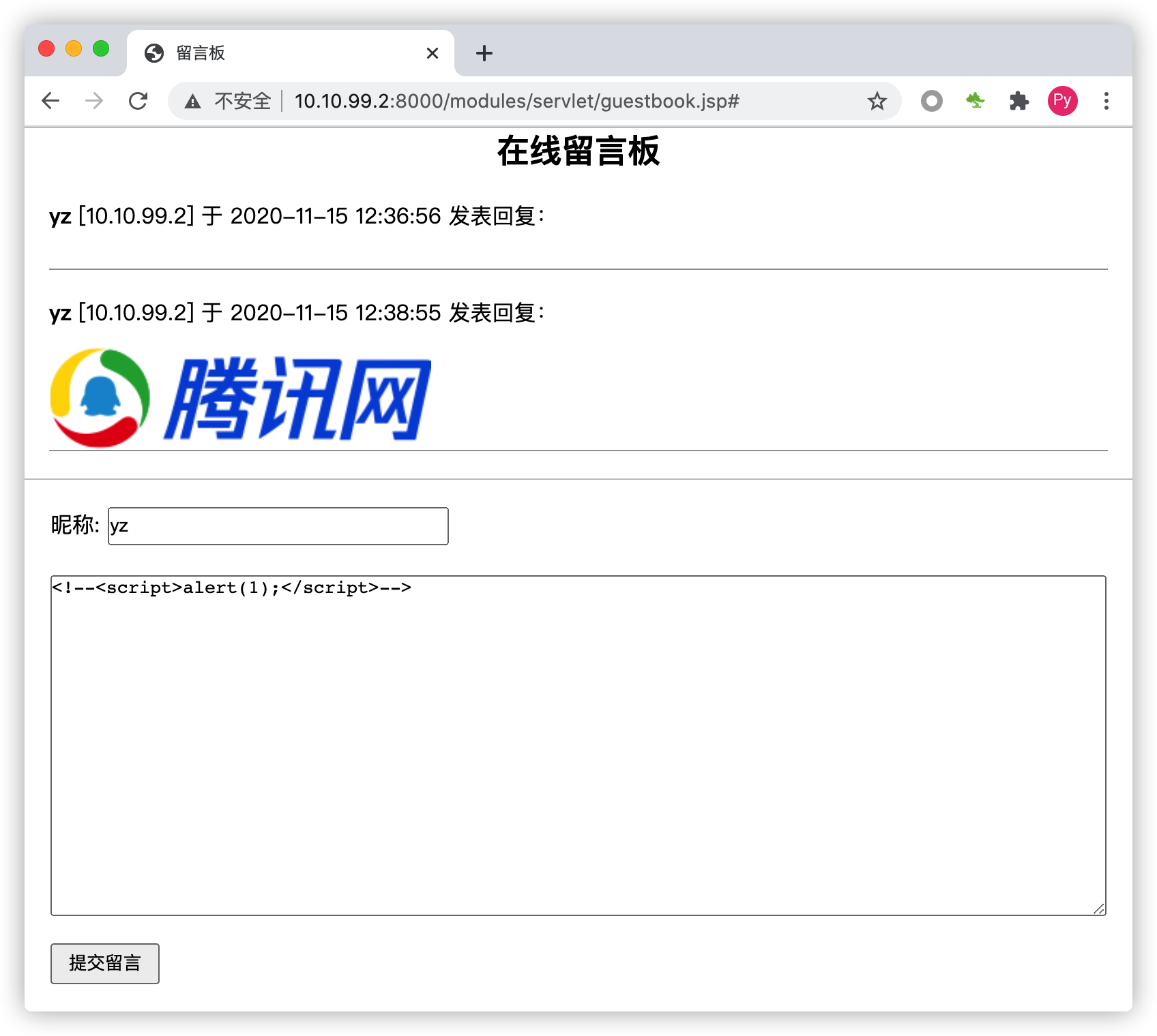 访问:http://10.10.99.2:8000/modules/servlet/guestbook.jsp,并在留言内容出填入xss测试代码,如下: