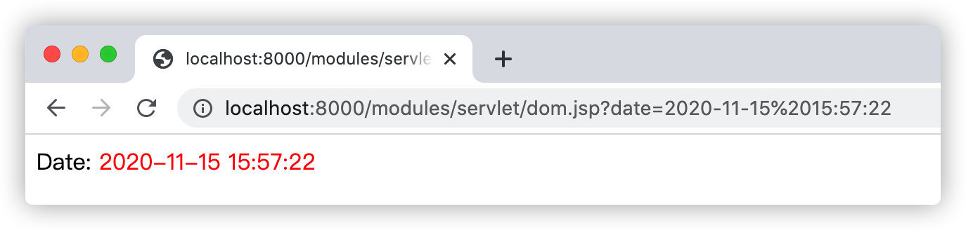 正常请求测试:[http://localhost:8000/modules/servlet/dom.jsp?date=2020-11-15%2015:57:22](http://localhost:8000/modules/servlet/dom.jsp?date=2020-11-15 15:57:22)