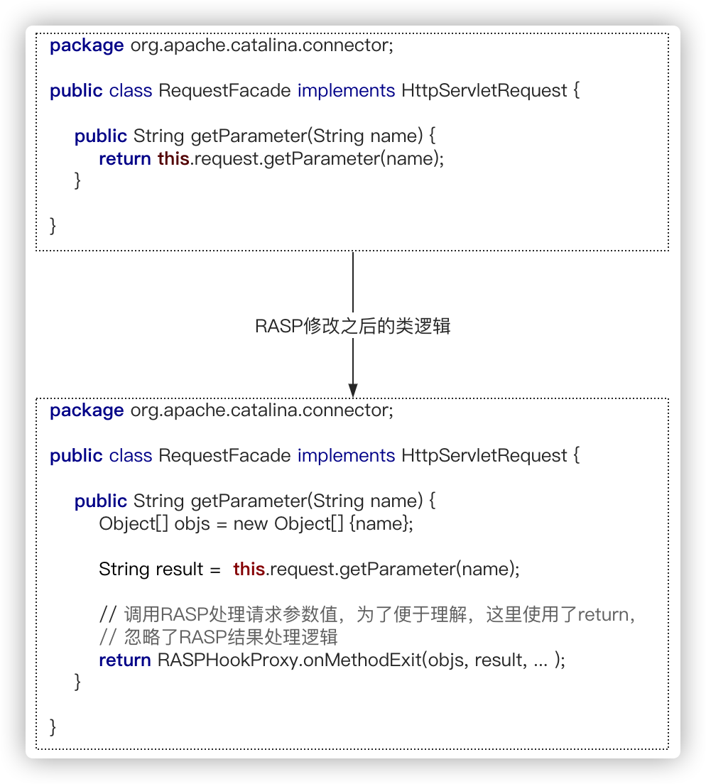 RASP可以实现类似于全局XSSFilter的请求参数过滤功能,比较稳定的一种方式是Hook到javax.servlet.ServletRequest接口的实现类的getParameter/getParameterValues/getParameterMap等核心方法,在该方法return之后插入RASP的检测代码。这种实现方案虽然麻烦,但是可以避免触发Http请求参数解析问题(Web应用无法获取getInputStream和乱码等问题)。