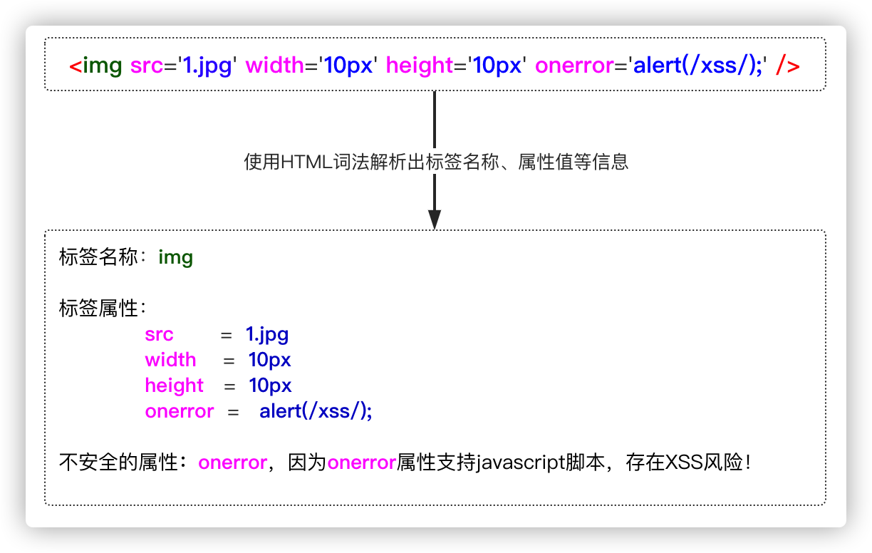 为了支持一些常用的HTML标签和HTML标签属性,RASP可以通过词法解析的方式,将传入的字符串参数值解析成HTML片段,然后分析其中的标签和属性是否合法即可。
