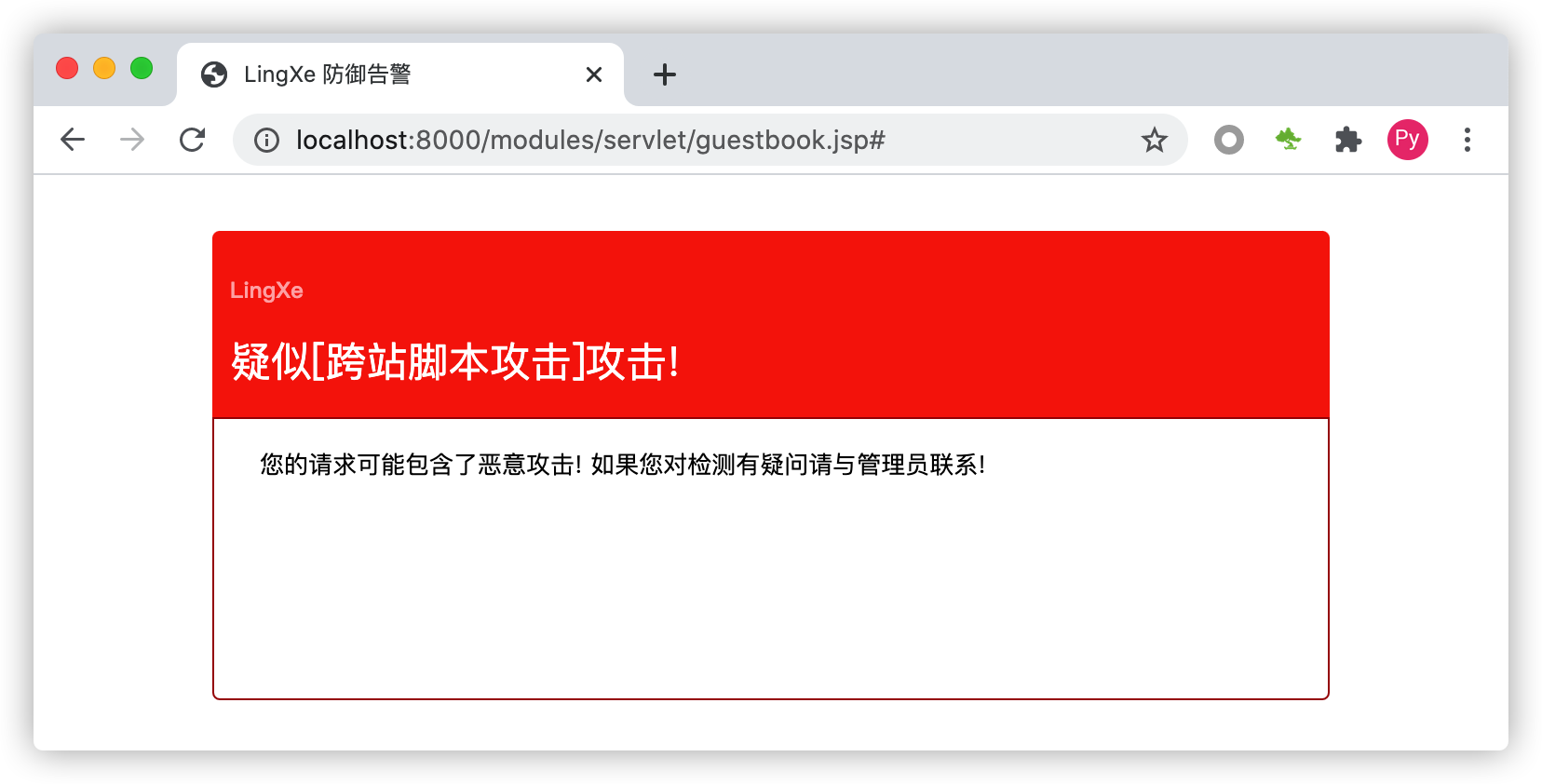 请求XSS示例程序:http://localhost:8000/modules/servlet/xss.jsp?input=%3Cscript%3Ealert(%27xss%27);%3C/script%3E