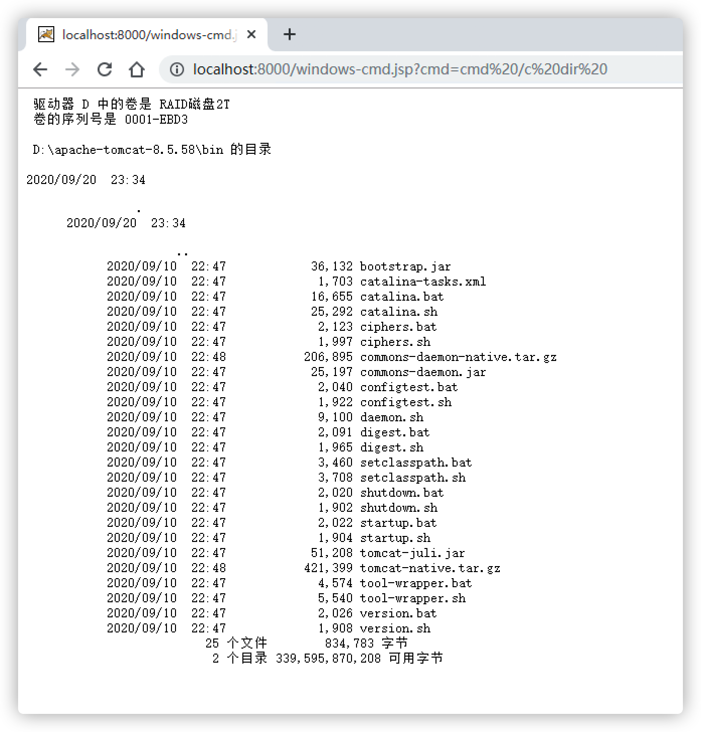 Windows系统,请求:[http://localhost:8000/windows-cmd.jsp?cmd=cmd%20/c%20dir%20](http://localhost:8000/windows-cmd.jsp?cmd=cmd /c dir ),如下图: